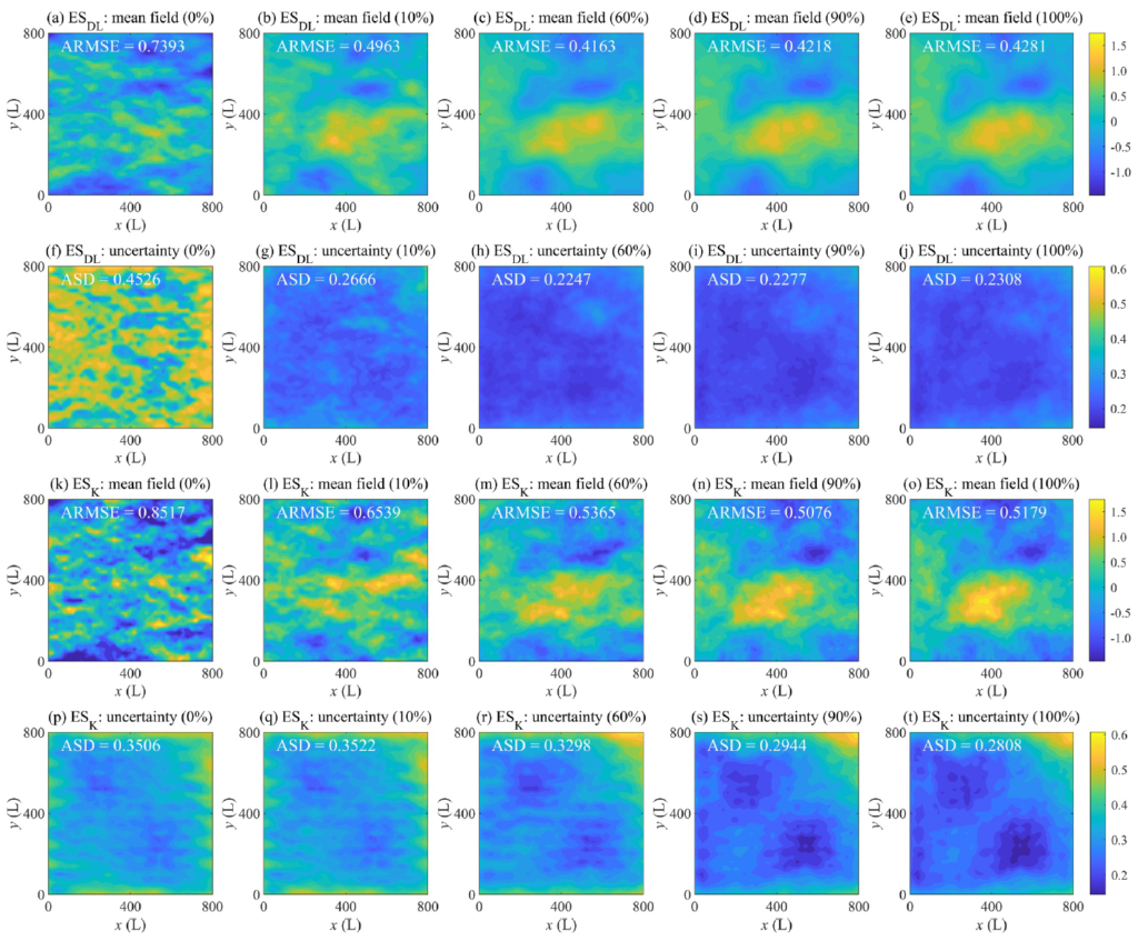 研究结果表明,在偏差先验的条件下,得益于深度学习模型的非线性特征捕捉与模式识别能力,ESDL的表现通常优于ESK。即便仅将少量无偏样本纳入混合先验集合,也能显著提升两种数据同化方法的性能(图4)。ESDL在从混合先验中提取有效信息方面展现出优势,从而得到了更精确的含水层刻画和更优的数据匹配结果。此外,即使完全没有无偏先验信息,ESDL与混合先验策略的结合依然能够提供一个稳健的数据同化框架,有效地完成含水层参数的反演。总体而言,所提出的混合先验框架与ESDL的结合,为减少数据同化过程中对无偏先验的依赖,提供了一个具有广阔前景的解决方案。