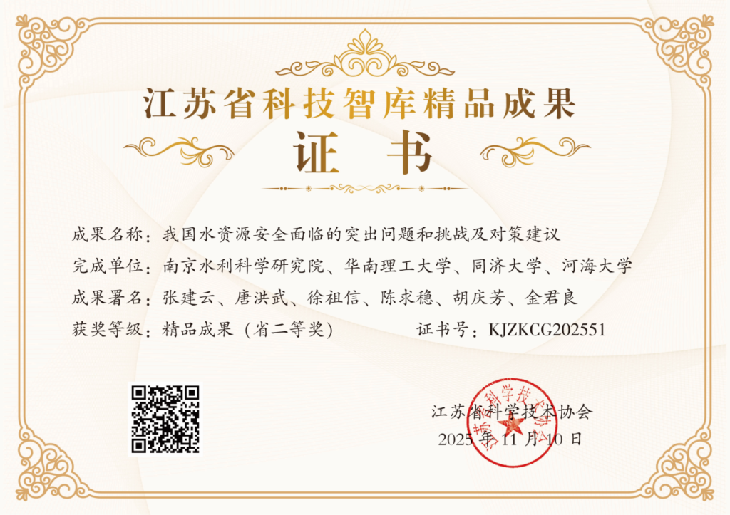 近日,江苏省科学技术协会公布了江苏省科技智库优秀成果精品成果名单。其中,由我院院长张建云院士牵头提交的《我国水资源安全面临的突出问题和挑战及对策》荣获“2025年度江苏省科技智库精品成果二等奖”。该成果此前以内刊形式被国家有关部门采用。